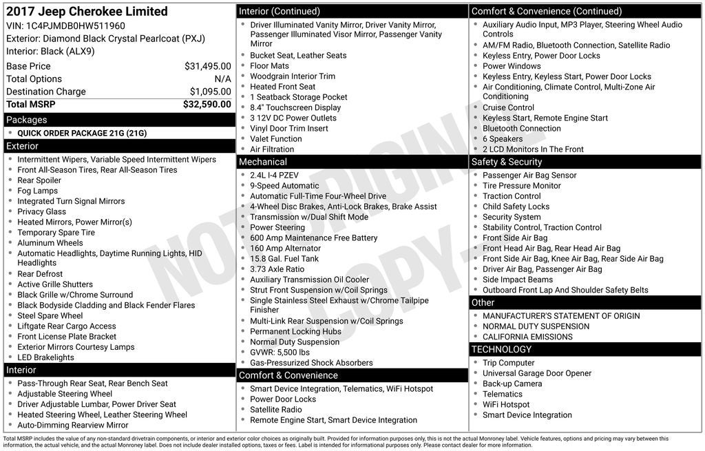2017 Jeep Cherokee Limited in Diamond Black Crystal Pearlcoat vehicle highlights include.., 4WD, PARKVIEW BACK UP CAMERA, DUAL AC, REMOTE START, ENTER-N-GO, AUTOMATIC, PREMIUM LEATHER HEATED STEERING WHEEL, AMBIENT LIGHTING, LED DAY TIME RUNNING LAMPS, WINDSHIELD WIPER DE-ICER, SELEC-TERRAIN SYSTEM, SIRIUS XM*, 8.4 PREMIUM TOUCH SCREEN, INTEGRATED VOICE CONTROL, UCONNECT, POWERED & HEATED MANUAL FOLD MIRRORS, QUALITY, PREMIUM LEATHER TRIMMED SEATING, POWER DRIVER SEAT, SPORT SEATS, HEATED SEATS, LED TAIL LIGHTS, BRIGHT EXHAUST TIP, ELECTRONIC ROLL MITIGATION, CARGO MANAGEMENT SYSTEM, ROOF RACKS, HILL START ASSIST, 2.4L I4 MultiAir, 9-Speed 948TE Automatic, 3.73 Axle Ratio, 6 Speakers, 8.4 Touchscreen Display, ABS brakes, Active Grille Shutters, Alloy wheels, AM/FM radio: SiriusXM, Auto-dimming Rear-View mirror, Automatic temperature control, Auxiliary Transmission Oil Cooler, Brake assist, Compass, Delay-off headlights, Driver vanity mirror, Electronic Stability Control, Emergency communication system: Uconnect Access, Engine Oil Cooler, Exterior Mirrors Courtesy Lamps, Exterior Mirrors w/Supplemental Signals, Four wheel independent suspension, Front anti-roll bar, Front Center Armrest, Front dual zone A/C, Front fog lights, Front reading lights, Fully automatic headlights, Garage door transmitter, Heated door mirrors, Heated front seats, Heated steering wheel, High intensity discharge headlights: Bi-Xenon, Illuminated entry, Integrated Voice Command w/Bluetooth®, Leather Shift Knob, Leather Trimmed Bucket Seats, Low tire pressure warning, Manufacturer's Statement of Origin, Occupant sensing airbag, Outside temperature display, Overhead console, ParkView Rear Back-Up Camera, Passenger vanity mirror, Power door mirrors, Power driver seat, Power steering, Power windows, Radio data system, Radio: Uconnect 3C w/8.4 Display, Rear reading lights, Rear seat center armrest, Rear side impact airbag, Rear window defroster, Rear window wiper, Remote keyless entry, Roof rack: rails only, Security system, SIRIUSXM Satellite Radio, Speed control, Speed-sensing steering, Split folding rear seat, Spoiler, Steering wheel mounted audio controls, Tachometer, Traction control, Turn signal indicator mirrors, Uconnect Access, Variably intermittent wipers, Voltmeter, Wheels: 18 x 7 Polished Aluminum (DISC).