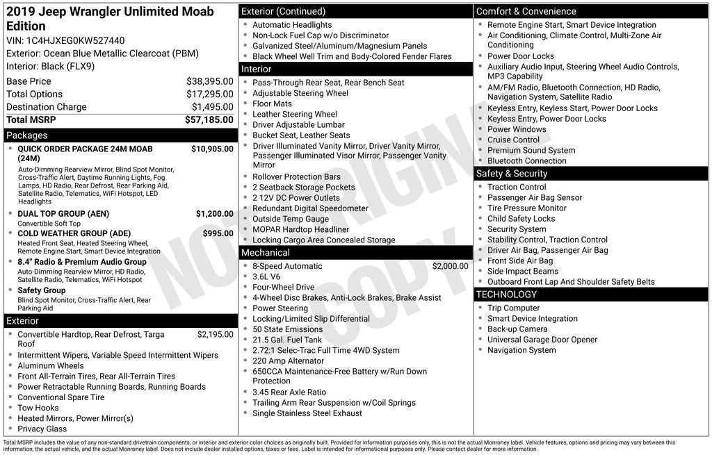 2019 Jeep Wrangler Unlimited Moab in Ocean Blue Metallic Clearcoat vehicle highlights include.., FORD BLUE CPO, ACCIDENT FREE, SUPER LOW MILES, 4WD, HARD TOP, VOICE ACTIVATED NAVIGATION w/TOUCH SCREEN, BLIS W/CROSS-PATH PROTECTION, PARKSENSE REAR PARK ASSIST, PARKVIEW BACK UP CAMERA, DUAL AC, REMOTE START, AUTOMATIC, APPLE CAR PLAY/ANDROID AUTO, PREMIUM LEATHER HEATED STEERING WHEEL, HOOD VENTS, SELEC-TRAC FT 4WD SYSTEM, FRONT & REAR USB, SIRIUS XM*, HD RADIO, MEDIA HUB, 8.4 PREMIUM TOUCH SCREEN, ALPINE PREMIUM SPEAKER SYSTEM, INTEGRATED VOICE CONTROL, UCONNECT, AUTOMATIC DIMMING REAR VIEW MIRROR, INTERIOR LED LIGHTING, 115V POWER OUTLET(S), TRAILER SWAY DAMPING, SKID PLATES, QUALITY, HEATED SEATS, STEEL FRONT BUMPER, COMMAND-TRAC* SHIFT-ON-FLY, GAS CHARGED SHOCKS, NEXT GENERATION DANA*44 HD REAR AXLE, ELECTRONIC ROLL MITIGATION, ALL-WEATHER FLOOR MATS, TIP START, HILL DESCENT CONTROL, UNIVERSAL GARAGE REMOTE, HEAVY DUTY ROCK SLIDER w/STEP ASSIST, 3.6L V6 24V VVT, 8-Speed Automatic, 3.45 Rear Axle Ratio, 4G LTE Wi-Fi Hot Spot, 5-Year SiriusXM Travel Link Service, 8.4 Radio & Premium Audio Group, 8.4 Touchscreen Display, ABS brakes, Alloy wheels, AM/FM radio: SiriusXM, Anti-Spin Differential Rear Axle, Apple CarPlay/Android Auto, Auto-Dimming Rear-View Mirror, Black Badges, Blind Spot & Cross Path Detection, Body Color 3-Piece Hard Top, Body Color Grille w/Gloss Black, Brake assist, Cloth Low-Back Bucket Seats, Cold Weather Group, Compass, Daytime Running Lamps LED Accents, Delay-off headlights, Driver door bin, Driver vanity mirror, Dual front side impact airbags, Dual Top Group, Dual Vented Hood, Electronic Stability Control, Emergency/Assistance Call, For Details, Visit DriveUconnect.ca, Freedom Panel Storage Bag, Front anti-roll bar, Front Bucket Seats, Front Center Armrest w/Storage, Front dual zone A/C, Front fog lights, Front LED Fog Lamps, Front reading lights, Fully automatic headlights, Garage door transmitter, GPS Navigation, HD Radio, Heated door mirrors, Heated Front Seats, Heated Steering Wheel, Heavy Duty Suspension w/Gas Shocks, Illuminated entry, Integrated roll-over protection, Leather steering wheel, LED Lighting Group, LED Reflector Headlamps, LED Taillamps, Low tire pressure warning, McKinley Leather Seats w/Jeep Logo, Moab Edition, Moab Hood Badging, MOPAR All-Weather Floor Mats, MOPAR Hardtop Headliner, Non-Lock Fuel Cap w/o Discriminator, Occupant sensing airbag, Panic alarm, ParkSense Rear Park Assist System, ParkView Rear Back-Up Camera, Power door mirrors, Premium Black Sunrider Soft Top w/Dual Top Group, Premium Wrapped I/P Bezels, Quick Order Package 24M Moab, Radio data system, Radio: Uconnect 4C Nav w/8.4 Display, Rear anti-roll bar, Rear Window Defroster, Rear Window Wiper/Washer, Remote keyless entry, Remote Proximity Keyless Entry, Remote Start System, Safety Group, Security system, Speed control, Split folding rear seat, Steel Front Bumper, Steering wheel mounted audio controls, Telescoping steering wheel, Traction control, Variably intermittent wipers, Voltmeter, Wheels: 17 x 7.5 Moab Black Aluminum, Wheels: 18 x 7.5 Polished w/Gray Spokes.