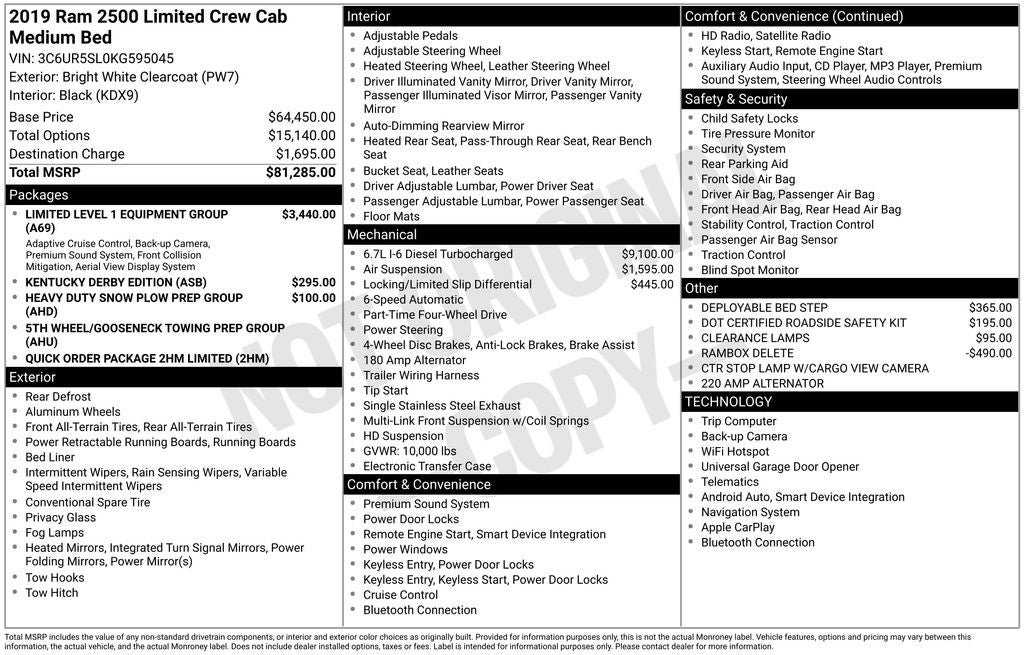 2019 Ram 2500 Limited in Bright White Clearcoat vehicle highlights include.., FORD BLUE CPO, 1 OWNER, 4WD, VOICE ACTIVATED NAVIGATION w/TOUCH SCREEN, BLIS W/CROSS-PATH PROTECTION, SURROUND VIEW CAMERA SYSTEM, TRAILER REVERSE GUIDANCE, PARKSENSE REAR PARK ASSIST, PARKVIEW BACK UP CAMERA, FULL SPEED FORWARD COLLISION BRAKING, ADAPTIVE CRUISE CONTROL, DUAL AC, REMOTE START, PUSH BUTTON IGNITION, REMOTE KEYLESS ENTRY, ILLUMINATED ENTRY, AUTOMATIC, APPLE CAR PLAY/ANDROID AUTO, PREMIUM INTERIOR, WIRELESS CHARGING PAD, SIRIUS GUARDIAN, SIRIUS XM w 360L, 12. PREMIUM TOUCH SCREEN, ALPINE PREMIUM SPEAKER SYSTEM, HARMAN KARDAN PREMIUM AUDIO, INTEGRATED VOICE CONTROL, UCONNECT, CENTER HIGH MOUNT STOP LIGHT, ROOF CLEARANCE LIGHTS, DEPLOYABLE BED STEP, POWER DEPLOYABLE RUNNING BOARDS, LED FOG LIGHTS, 5th WHEEL/GOOSE NECK, HEATED/POWERED FOLD-AWAY MIRRORS, TRAILER SWAY CONTROL, DAMPENED TAILGATE, SPRAY-IN BEDLINER, LED BED LIGHTING, POWER TAILGATE RELEASE, TRANSFER CASE SKID PLATE, QUALITY, MEMORY DRIVER SEAT, POWER SEATS, SPORT SEATS, HEATED & COOLED FRONT SEATS, VENTILATED SEATS, HEATED 2ND ROW, LED PROJECTOR HEADLIGHTS, LED TAIL LIGHTS, ELECT 4X4 SHIFT-ON-THE-FLY, TRACTION CONTROL, T.P.M.S., SENTRY KEY, CARGO MANAGEMENT SYSTEM, HILL START ASSIST, AUTO LEVEL REAR AIR SUSPENSION, Cummins 6.7L I6 Turbodiesel, 6-Speed Automatic, 1-Year SiriusXM Guardian Trial, 12 Touchscreen Display, 17 Speaker High Performance Audio, 2 Red Vinyl Flags, 220 Amp Alternator, 3 Reflecting Triangles, 3.73 Axle Ratio, 5th Wheel/Gooseneck Towing Prep Group, ABS brakes, Active Noise Control System, Adaptive Cruise Control w/Stop, Adjustable pedals, Alloy wheels, AM/FM radio: SiriusXM with 360L, Anti-Spin Differential Rear Axle, Apple CarPlay, Apple CarPlay/Android Auto, Audio memory, Auto High-beam Headlights, Auto Level Rear Air Suspension, Auto-dimming Rear-View mirror, Automatic temperature control, Brake assist, Clearance Lamps, Compass, CTR Stop Lamp w/Cargo View Camera, Delay-off headlights, Deployable Bed Step, Disassociated Touchscreen Display, DOT Certified Roadside Safety Kit, DOT Fire Extinguisher, Driver vanity mirror, Electronic Stability Control, Electronically Controlled Throttle, Emergency communication system: SiriusXM Guardian, Front anti-roll bar, Front Bucket Seats, Front Center Armrest w/Storage, Front dual zone A/C, Front fog lights, Front reading lights, Full Speed Forward Collision Warning Plus, Fully automatic headlights, Garage door transmitter, Genuine wood console insert, Genuine wood dashboard insert, Genuine wood door panel insert, Google Android Auto, GPS Antenna Input, GPS Navigation, Grille-Longhorn Large Chrome Billets, HD Radio, Heated door mirrors, Heated front seats, Heated rear seats, Heated steering wheel, Heavy Duty Snow Plow Prep Group, Illuminated entry, Integrated Voice Command w/Bluetooth®, Kentucky Derby Edition, Kentucky Derby Edition Decal, Leather steering wheel, Limited Leather Bucket Seats, Limited Leather Embossed Bucket Seats, Limited Level 1 Equipment Group, Low tire pressure warning, Memory seat, Navigation System, Occupant sensing airbag, Outside temperature display, Overhead console, Painted Front Bumper, Painted Rear Bumper, ParkView Rear Back-Up Camera, Passenger vanity mirror, Pedal memory, Pickup Box, Power door mirrors, Power passenger seat, Radio data system, Radio: Uconnect 12.0 w/Navigation, Rain sensing wipers, Rear anti-roll bar, Rear reading lights, Rear seat center armrest, Rear step bumper, Rear Window Defroster, Rear window defroster, Remote CD player, Remote keyless entry, Security system, Selectable Tire Fill Alert, SiriusXM Satellite Radio, SiriusXM Traffic Plus, SiriusXM Travel Link, SiriusXM w/360L, Spare Fuses, Speed control, Split folding rear seat, Steering wheel mounted audio controls, Supplemental Heater, Surround View Camera System, Tachometer, Tilt steering wheel, Tip Start, Traction control, Trailer Reverse Guidance, Trip computer, Turn signal indicator mirrors, USB Host Flip, Vari