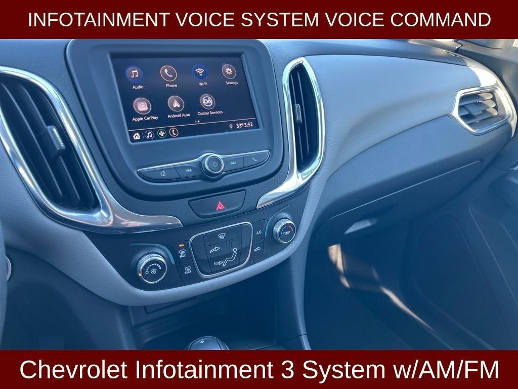 - Audio system, Chevrolet Infotainment 3 system, 7" diagonal color touchscreen, AM/FM stereo. Additional features for compatible phones include: Bluetooth audio streaming for 2 active devices, voice command pass-through to phone, Apple CarPlay and Android Auto capable.