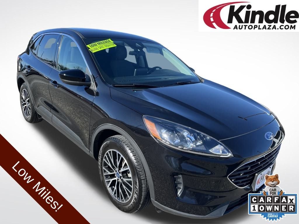 2021 Ford Escape Plug-In Hybrid SE in Black Metallic vehicle highlights include.., 1 OWNER, LOW MILES, C. V. T., BLIS W/CROSS-PATH PROTECTION, FORD CO-PILOT 360*, REAR VIEW CAMERA w /REVERSE SENSING, PEDESTRIAN/CYCLIST WARNING, PRE COLLISION ASSIST W/AEB, LANE KEEPING, DUAL AC, INTELLIGENT ACCESS W/PUSH BUTTON START, REMOTE KEYLESS ENTRY, ILLUMINATED ENTRY, AUTOMATIC, ELECTRIC PARK BRAKE, ROTARY GEAR SHIFTER, REAR SPOILER, USB(A) & USB(C), SIRIUS XM*, 8. PREMIUM TOUCH SCREEN, FORDPASS CONNECT, 12V POWER POINTS, QUALITY, LATCH* CHILD SAFETY SYSTEM, ADVANCETRAC* W/RSC, AUTOMATIC HEADLIGHTS, LED TAIL LIGHTS, DUAL EXHAUST w/CHROME TIPS, ACTIVE GRILLE SHUTTERS, COMPACT SPARE, T.P.M.S., SOS POST CRASH ALERT, REAR PRIVACY GLASS, 2.5L iVCT, eCVT, 2.91 Axle Ratio, 6 Speakers, ABS brakes, Air Conditioning, Alloy wheels, AM/FM radio: SiriusXM, Auto High-beam Headlights, Automatic temperature control, Brake assist, Compass, Delay-off headlights, Driver vanity mirror, Electronic Stability Control, Emergency communication system: SYNC 3 911 Assist, Exterior Parking Camera Rear, Four wheel independent suspension, Front anti-roll bar, Front Bucket Seats, Front Center Armrest, Fully automatic headlights, Illuminated entry, Low tire pressure warning, Occupant sensing airbag, Overhead console, Panic alarm, Passenger vanity mirror, Power door mirrors, Power steering, Radio data system, Rear anti-roll bar, Rear reading lights, Rear window defroster, Rear window wiper, Remote keyless entry, Speed control, Speed-sensing steering, Speed-Sensitive Wipers, Split folding rear seat, Spoiler, Steering wheel mounted audio controls, SYNC 3 Communications & Entertainment System, Telescoping steering wheel, Tilt steering wheel, Traction control, Trip computer, Unique Cloth Front Bucket Seats, Variably intermittent wipers, Wheels: 18 Machined-Face Ebony-Painted Aluminum.