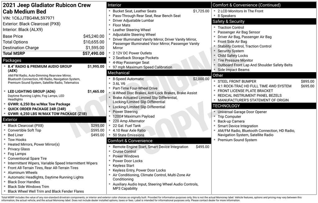 2021 Jeep Gladiator Rubicon in Black Clearcoat vehicle highlights include.., CERTIFIED READY, 1 OWNER, CLEAN CAR FAX, SUPER LOW MILES, 4WD, PREMIUM SUNRIDER SOFT TOP, NAVIGATION, PARKVIEW BACK UP CAMERA, REMOTE START, PUSH BUTTON IGNITION, REMOTE KEYLESS ENTRY, ILLUMINATED ENTRY, AUTOMATIC, APPLE CAR PLAY/ANDROID AUTO, SIRIUS XM*, SIRIUS GUARDIAN, 4G WIFI MODEM, WIFI HOT SPOT, HD RADIO, Bluetooth®, AUXILLARY INPUT, MEDIA HUB, 8.4 PREMIUM TOUCH SCREEN, ALPINE PREMIUM SPEAKER SYSTEM, INTEGRATED VOICE CONTROL, UCONNECT, JEEP WAVE, RED TOW HOOKS, AUTOMATIC DIMMING REAR VIEW MIRROR, LED FOG LIGHTS, SELEC-SPEED CONTROL, SPRAY-IN BEDLINER BY MOPAR*, SKID PLATES, QUALITY, PREMIUM LEATHER TRIMMED SEATING, LED REFLECTOR HEADLIGHTS, LED TAIL LIGHTS, TOOL KIT TOP REMOVAL, OFF ROAD DISPLAY PAGES, 4:1 Rock-Trac® Part-Time 4WD System, TRU-LOK AXLES, FOX PERFORMANCE SUSPENSION, FULL SIZE SPARE, SPECIFIC TIRE T.P.M.S., FRONT & REAR FLOOR MATS, HEAVY-DUTY DANA* 44 WIDE FRONT & REAR AXLES, WINCH-CAPABLE STEEL FRONT BUMPER, 3.6L V6 24V VVT, 8-Speed Automatic, 1-Year SiriusXM Guardian Trial, 4:1 Rock-Trac HD Full Time 4WD System, 4.10 Rear Axle Ratio, 5-Year SiriusXM Traffic Service, 5-Year SiriusXM Travel Link Service, 8 Speakers, 8.4 Radio & Premium Audio Group, 8.4 Touchscreen Display, 97 mph Maximum Speed Calibration, ABS brakes, Alloy wheels, Alpine Premium Audio System, AM/FM radio: SiriusXM, Apple CarPlay/Android Auto, Auto-Dimming Rear-View Mirror, Automatic temperature control, Brake assist, Compass, Daytime Running Lamps LED Accents, Delay-off headlights, Driver vanity mirror, Electronic Stability Control, Emergency/Assistance Call, For Details, Visit DriveUconnect.com, Front anti-roll bar, Front Center Armrest w/Storage, Front dual zone A/C, Front fog lights, Front LED Fog Lamps, Front License Plate Bracket, Front reading lights, Fully automatic headlights, Garage door transmitter, GPS Navigation, GVWR: 6,250 lbs w/Max Tow Package, HD Radio, Heated door mirrors, Illuminated entry, Integrated roll-over protection, Leather steering wheel, LED Lighting Group, LED Park Turn Lamps, LED Premium Reflector Headlamps, LED Taillamps, Low tire pressure warning, Manufacturer's Statement of Origin, MOPAR Spray In Bedliner, Occupant sensing airbag, Outside temperature display, ParkView Rear Back-Up Camera, Passenger vanity mirror, Performance Suspension, Power door mirrors, Premium Black Sunrider Soft Top, Premium Cloth Low-Back Bucket Seats, Radio data system, Radio: Uconnect 4C Nav w/8.4 Display, Rear anti-roll bar, Rear reading lights, Redical Instrument Panel Bezels, Remote keyless entry, Remote Start System, Security system, SiriusXM Traffic Plus, SiriusXM Travel Link, Speed control, Split folding rear seat, Steel Front Bumper, Steering wheel mounted audio controls, Tachometer, Traction control, Variably intermittent wipers, Voltmeter, Wheels: 17 x 7.5 Granite Crystal Aluminum.