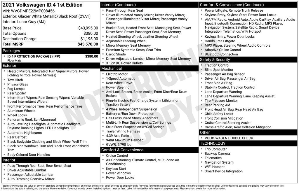 - Radio: Discover Pro Max w/12" Touchscreen Nav -inc: FM/HD radio w/media player, voice control w/center display proximity sensor, 6-speaker sound system plus center speaker (7 speakers total), wireless inductive charger (for compatible devices), App-Connect smartphone integration (w/Apple CarPlay, Android Auto and MirrorLink) via USB, wireless App-Connect smartphone integration (for compatible devices) w/multi-phone pairing capability, capability for in-vehicle 4G LTE enabled Wi-Fi (cellular data plan required; includes limited trial), capability for VW Car-Net services (capabilities for certain services vary; requires enrollment or subscription), Bluetooth connectivity (for compatible devices) and SiriusXM (3-month All Access trial subscription; requires acceptance of terms)