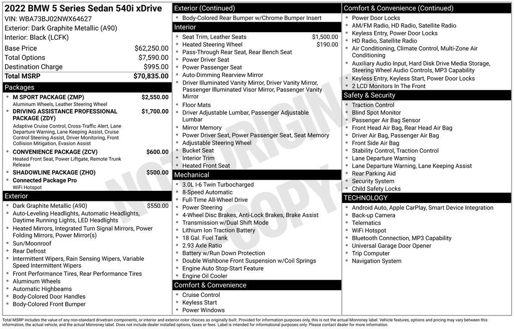 2022 BMW 5 Series 540i xDrive in Dark Graphite Metallic vehicle highlights include.., 1 OWNER, CLEAN CAR FAX, LOW MILES, AWD, VOICE ACTIVATED NAVIGATION w/TOUCH SCREEN, MOONROOF, BLIS W/CROSS-PATH PROTECTION, ACTIVE PARK ASSIST, REAR VIEW CAMERA w /REVERSE SENSING, ACTIVE DRIVING ASSIST, FORWARD COLLISION DETECTION, FOLLOWING DISTANCE MONITOR, REMOTE KEYLESS ENTRY, ILLUMINATED ENTRY, AUTOMATIC, PREMIUM CONNECTIVITY, HEATED STEERING WHEEL, AMBIENT LIGHTING, RAIN SENSING WIPERS, CONFIGURABLE DRIVE MODES, REAL TIME TRAFFIC DISPLAY, SIRIUS XM w 360L, WIFI HOT SPOT, Bluetooth®, 12.3 PREMIUM TOUCH SCREEN, INTEGRATED VOICE CONTROL, BMW TeleServices, REMOTE LOCKING TAILGATE, POWERED ADJUSTABLE HEATED MIRRORS, QUALITY, MEMORY DRIVER SEAT, POWER SEATS, SPORT SEATS, HEATED SEATS, LED AUTO HEADLIGHTS, SPORT SUSPENSION, DYNAMIC STABILTY CONTROL, MULTI CLIMATE CONTROL, BMW ASSIST eCALL, LIVE COCKPIT, ANTHRACITE HEADLINER, MULTI-INPUT iDRIVE 7.0, AWD, Black Leather, 12 Speakers, ABS brakes, Active Driving Assistant Pro, Aerodynamic Kit, Air Conditioning, Alloy wheels, AM/FM radio: SiriusXM with 360L, Apple CarPlay & Android Auto Compatibility, Auto High-beam Headlights, Auto tilt-away steering wheel, Auto-dimming door mirrors, Auto-dimming Rear-View mirror, Automatic temperature control, BMW Assist eCall, BMW TeleServices, Brake assist, Connected Package Pro, ConnectedDrive Services, Convenience Package, Delay-off headlights, Driver vanity mirror, Driving Assistance Professional Package, Dual front impact airbags, Electronic Stability Control, Emergency communication system: BMW Assist eCall, Enhanced Bluetooth®, Extended Shadowline Trim, Extended Traffic Jam Assistant, Exterior Parking Camera Rear, Four wheel independent suspension, Front anti-roll bar, Front Bucket Seats, Front Center Armrest, Front dual zone A/C, Front reading lights, Fully automatic headlights, Garage door transmitter, Genuine wood console insert, Genuine wood dashboard insert, Genuine wood door panel insert, Heated door mirrors, Heated Front Seats, Heated Steering Wheel, Hi-Fi Sound System, Illuminated entry, Leather Shift Knob, Leather steering wheel, Live Cockpit Pro w/Navi, Low tire pressure warning, Lumbar Support, M Shadowline Lights, M Sport Package, M Sport Pkg, M Sport Suspension, M Steering Wheel, Memory seat, Navigation System, Occupant sensing airbag, Outside temperature display, Passenger vanity mirror, Perforated Sensatec Upholstery, Power door mirrors, Power Front Seats, Power moonroof, Power passenger seat, Power Tailgate, Power windows, Radio data system, Radio: AM/FM Audio System, Rain sensing wipers, Rear reading lights, Rear seat center armrest, Rear window defroster, Remote keyless entry, Security system, Shadowline Exterior Trim, Shadowline Package, Speed control, Speed-sensing steering, Speed-Sensitive Wipers, Split folding rear seat, Sport Seats, Sport steering wheel, Steering wheel memory, Steering wheel mounted audio controls, Tachometer, Telescoping steering wheel, Tilt steering wheel, Traction control, Trip computer, Turn signal indicator mirrors, Variable Sport Steering, Variably intermittent wipers, Wheels: 19 x 8 M Y-Spoke Bi-Color Jet Black, Without Lines Designation Outside.