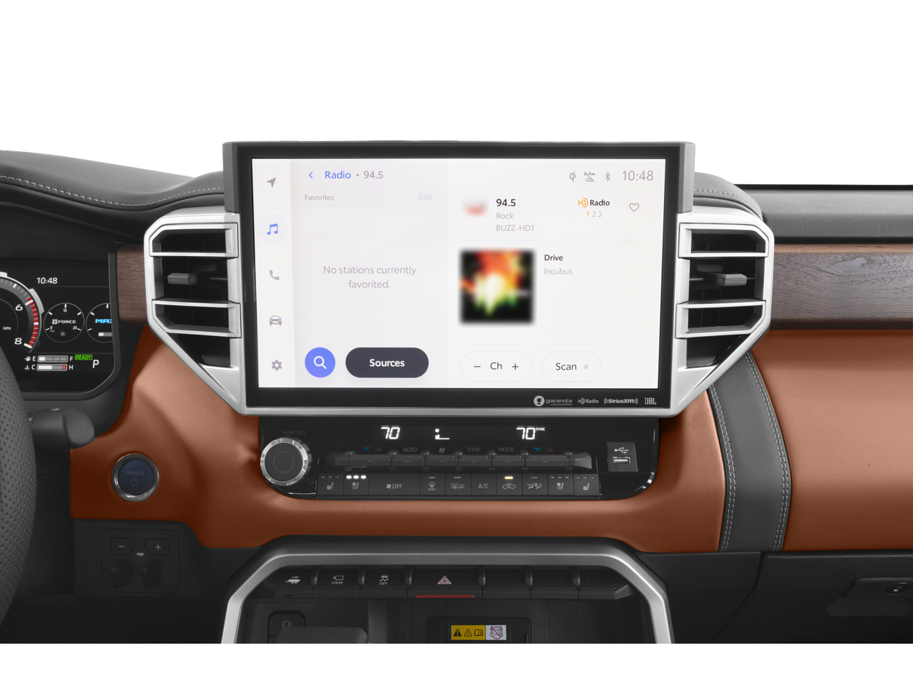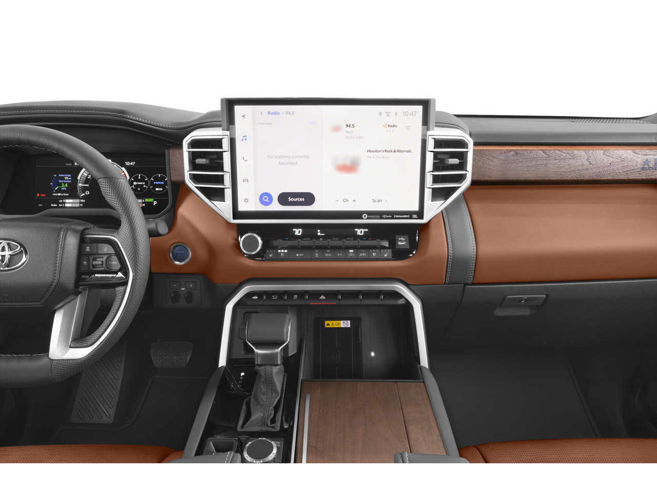 2024 Toyota Tundra Hybrid 1794 Edition in Silver vehicle highlights include.., 1 OWNER, CLEAN CAR FAX, 4WD, NAVIGATION, PANORAMIC VISTA SUNROOF, BLIS W/CROSS-PATH PROTECTION, FULL SPEED FORWARD COLLISION BRAKING, ADAPTIVE CRUISE CONTROL, PRE COLLISION ASSIST W/AEB, ROAD SIGN ASSIST, H.U.D. HEADS UP DISPLAY, LANE DEPARTURE, REMOTE KEYLESS ENTRY, ILLUMINATED ENTRY, AUTOMATIC, PREMIUM CONNECTIVITY, SIRIUS XM*, 14.4 PREMIUM TOUCH SCREEN, ENTUNE PREMIUM JBL AUDIO, 7 & 4 PIN WIRING HARNESS, EXTENDED RUNNING BOARDS, 120V POWER OUTLET(S), TOW HITCH RECEIVER, INTEGRATED TRAILER BRAKE, TRAILER SWAY CONTROL, QUALITY, MEMORY DRIVER SEAT, POWER SEATS, SPORT SEATS, HEATED & COOLED FRONT SEATS, VENTILATED SEATS, LEVELING HEADLIGHTS, TRAILER BACK UP ASSIST, 3.4L V6, 10-Speed Automatic, 12 Speakers, 3.31 Axle Ratio, ABS brakes, Alloy wheels, AM/FM radio: SiriusXM, Apple CarPlay/Android Auto, Auto High-beam Headlights, Auto-dimming door mirrors, Auto-dimming Rear-View mirror, Automatic temperature control, Brake assist, Bumpers: body-color, Delay-off headlights, Driver vanity mirror, Electronic Stability Control, Emergency communication system: Safety Connect (10-year trial), Exterior Parking Camera Rear, Front anti-roll bar, Front Bucket Seats, Front Center Armrest, Front dual zone A/C, Front fog lights, Front reading lights, Front wheel independent suspension, Fully automatic headlights, Garage door transmitter: HomeLink, Heated & Ventilated Front Bucket Seats, Heated door mirrors, Heated rear seats, Heated steering wheel, Illuminated entry, Leather Seat Trim, Leather Shift Knob, Low tire pressure warning, Memory seat, Navigation System, Outside temperature display, Overhead console, Panic alarm, Passenger vanity mirror, Power door mirrors, Power moonroof, Power passenger seat, Power windows, Radio data system, Radio: Premium Audio w/JBL, Rain sensing wipers, Rear reading lights, Rear seat center armrest, Rear step bumper, Rear window defroster, Remote keyless entry, Security system, Speed control, Speed-sensing steering, Split folding rear seat, Steering wheel memory, Steering wheel mounted audio controls, Tachometer, Traction control, Turn signal indicator mirrors, Variably intermittent wipers, Ventilated front seats, Voltmeter, Wheels: 20 x 8 Machined-Finish Alloy.
